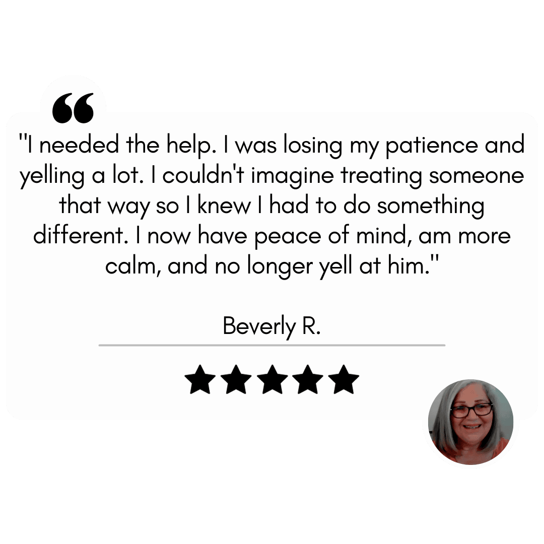 "I needed the help. I was losing my patience and yelling a lot. I couldn't imagine treating someone that way so I knew I had to do something different. I now have peace of mind, am more calm, and no longer yell at him."