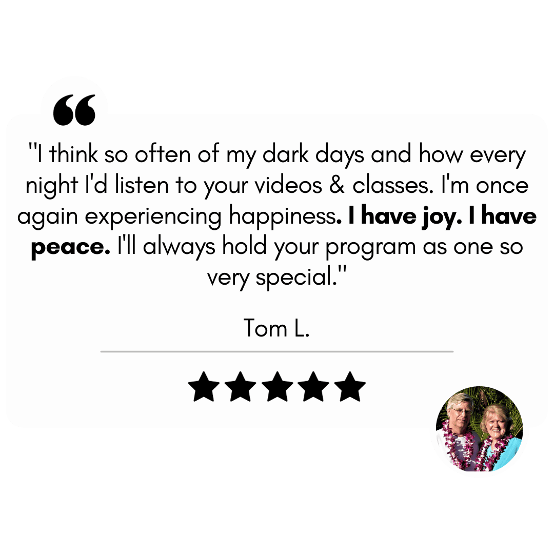 "I think so often of my dark days and how every night I'd listen to your videos & classes. I'm once again experiencing happiness. I have joy. I have peace. I'll always hold the name Dr. Natali and your program as one so very special."